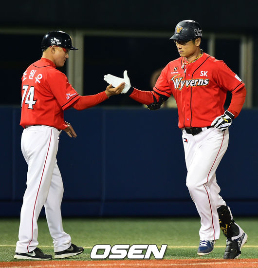 9회초 2사 만루 우월 만루포를 날린 SK 대타 박정권이 그라운드를 돌며 조원우 코치와 하이파이브를 나누고 있다.