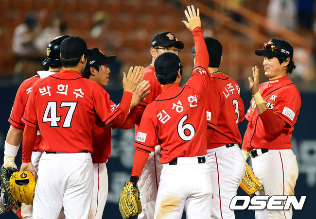 경기종료 후, 승리한 SK 선수들이 기쁨의 하이파이브를 나누고 있다. /ouxou@osen.co.kr