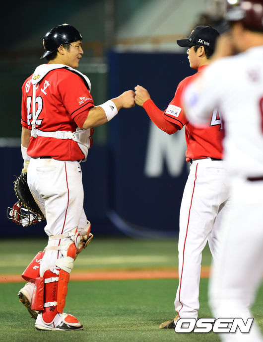 경기종료 후, 승리한 SK 정상호와 박희수가 기쁨의 인사를 나누고 있다. /ouxou@osen.co.kr