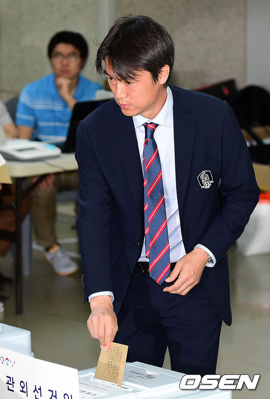 출국에 앞서 홍명보 감독이 사전 투표를 하고 있다.