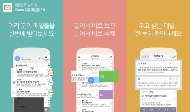 다음커뮤니케이션은 다음 메일앱을 대대적으로 개편한 ‘다음 메일앱 2.0’을 새롭게 선보인다고 30일 밝혔다. 다음 메일앱 2.0은 무제한 파일 교환, 편리한 동선을 앞세웠던 기존 기능들은 유지한 채 스마트폰에서 수시로 메일 서비스를 이 용하는 바쁜 현대인들을 위해 다계정 메일, 대화형 보기 등의 기능을 추가했다.