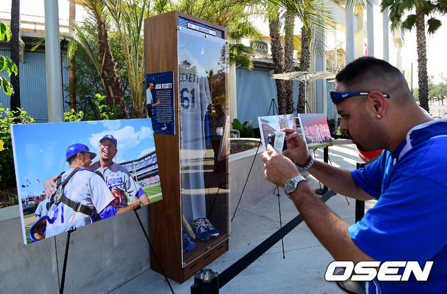 31일(이하 한국시간) 미국 캘리포니아주 로스앤젤레스 다저스타디움에서 '2014 메이저리그' LA 다저스와 피츠버그 파이어리츠의 경기가 열린다. 사진은 지난 26일 조시 베켓이 노히트노런을 기록한 필라델피아전 입었던 유니폼이 다저스타디움에 전시된 모습.