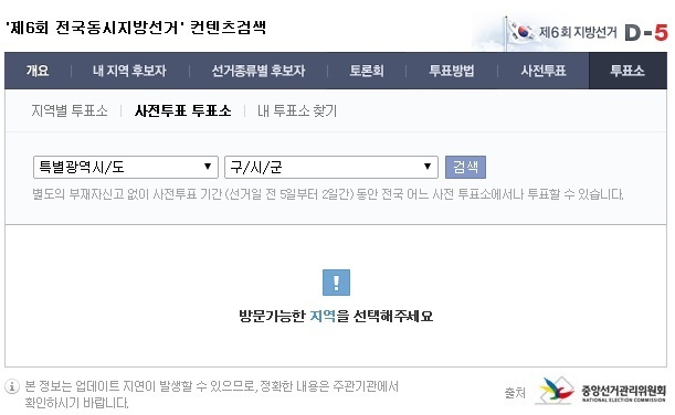 6월 4일에 있을 제 6회 전국동시지방선거의 사전투표가 전국 사전투표소에서 오는 30일부터 31일까지 시행된다. 이 기간 동안 유권자들은 전국에 위치한 사전투표소에서 사전투표에 참여할 수 있다. 투표 절차는 일반적인 방식과 같다. 신분증만 지참하면 된다.