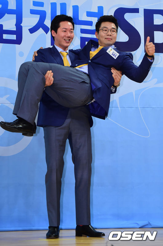 김동완 해설위원과 이재형 캐스터가 포토타임을 갖고 있다.
