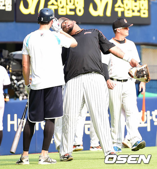 경기에 앞서 롯데 히메네스가 두산 칸투와 인사를 나누고 있다.