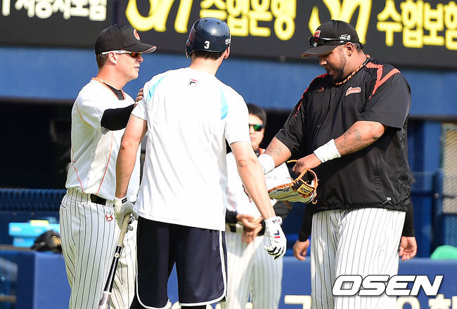 경기에 앞서 롯데 옥스프링과 히메네스가 두산 칸투와 인사를 나누고 있다.
