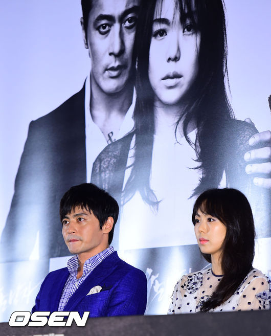 30일 오후 서울 왕십리 CGV에서 진행된 영화 '우는 남자'(감독 이정범) 언론배급시사회에서 장동건과 김민희가 취재진의 질문을 듣고 있다.