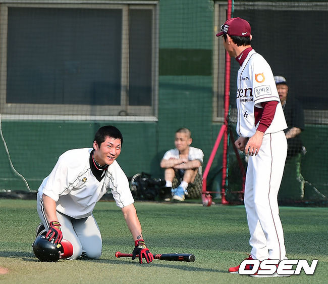 29일 오후 목동야구장에서 열리는 '2014 한국야쿠르트 세븐 프로야구' 넥센 히어로즈와 LG 트윈스의 경기에 앞서 LG 오지환이 넥센 염경엽 감독에게 인사를 하고 있다.