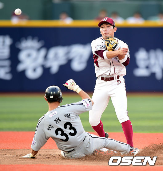 1회초 1사 1루 넥센 서건창이 LG 이진영의 3루 앞 땅볼때 1루주자 박용택을 포스아웃으로 잡아낸 뒤 1루로 송구하고 있다.