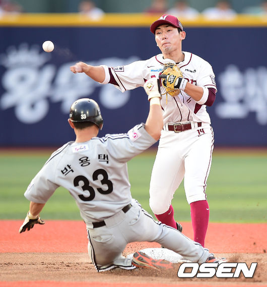 1회초 1사 1루 넥센 서건창이 LG 이진영의 3루 앞 땅볼때 1루주자 박용택을 포스아웃으로 잡아낸 뒤 1루로 송구하고 있다.