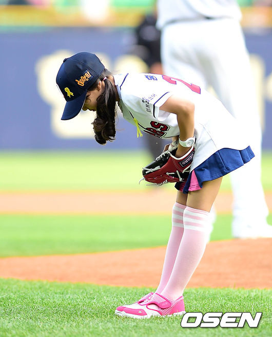 경기에 앞서 두산 홍성흔의 딸 아역 배우 홍화리가 팬들에게 인사를 하고 있다.