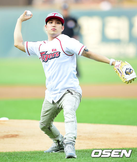 30일 오후 광주-KIA 챔피언스필드에서 열린 2014 한국야쿠르트 세븐 프로야구 KIA 타이거즈와 NC 다이노스의 경기, 가수 범키가 승리기원 시구를 하고 있다.