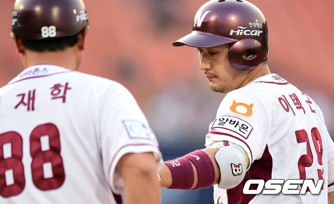 1회말 무사 2루 넥센 이택근이 1타점 적시타를 때린 뒤 심재학 코치와 하이파이브를 하고 있다.
