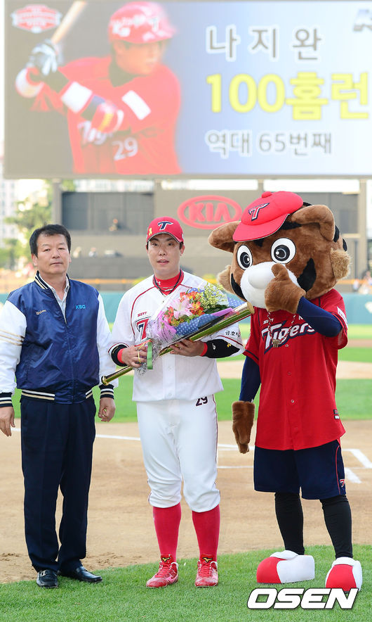 30일 오후 광주-KIA 챔피언스필드에서 열린 2014 한국야쿠르트 세븐 프로야구 KIA 타이거즈와 NC 다이노스의 경기, 경기 전 KIA 나지완의 100홈런 시상식때 황금 배트를 받고 포토타임을 갖고 있다.