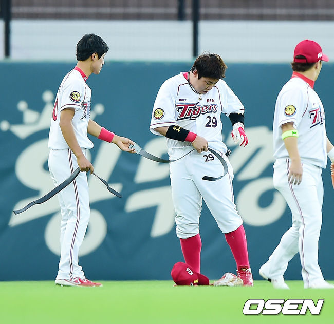 30일 오후 광주-KIA 챔피언스필드에서 열린 2014 한국야쿠르트 세븐 프로야구 KIA 타이거즈와 NC 다이노스의 경기, 3회초 선두타자 NC 박민우의 좌익수 플라이 아웃때 KIA 좌익수 나지완의 벨트에 문제가 생겨 벨트를 교체하고 있다.