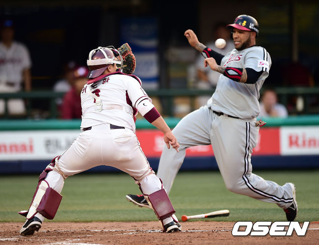 2회초 1사 2,3루 LG 조쉬벨이 최경철의 안타때 홈으로 쇄도하다 넥센 허도환에게 태그아웃 당하고 있다.