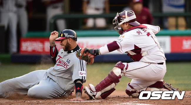 2회초 1사 2,3루 LG 조쉬벨이 최경철의 안타때 홈으로 쇄도하다 넥센 허도환에게 태그아웃 당하고 있다.