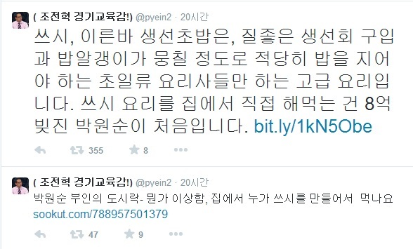 이어 변희재 대표는 "박원순은 무식한 기자들만 믿고 온몸에 거짓말 쳐바르고 다닙니다. 부인이 싸준 도시락에 스시가 들어있으면 '집에서 어떻게 스시를 만들어 먹냐' 질문 하나 할 수준의 기자가 없다는 거죠"라며 "일본 오뎅탕이 담긴 그릇도 스시집에 쓰는 전문 특수 컵입니다. 박원순과 부인이 집에다 스시집 차리지 않고서, 저런 특수용품을 왜 집에도 비치해놓나요"라며 박원순 후보의 도시락에 트집을 잡았다.