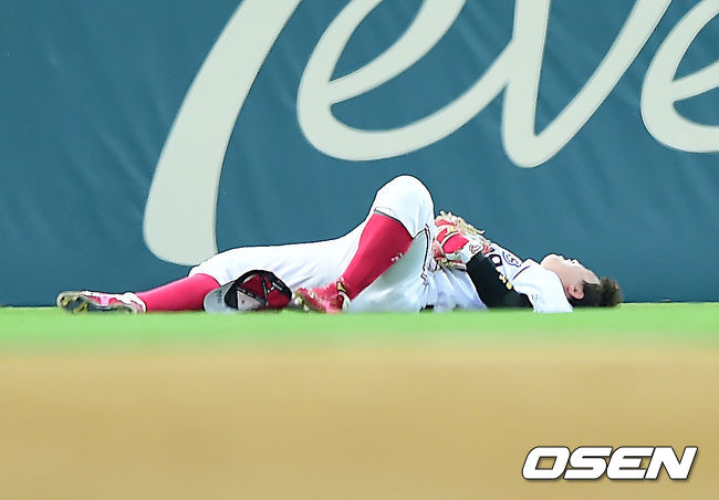 30일 오후 광주-KIA 챔피언스필드에서 열린 2014 한국야쿠르트 세븐 프로야구 KIA 타이거즈와 NC 다이노스의 경기, 3회초 선두타자 NC 박민우의 좌익수 플라이 아웃때 KIA 좌익수 나지완이 호수비 후 약간 고통을 호소하며 누워있다.