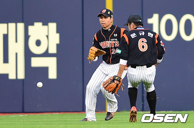 2회말 2사 2루에서 롯데 김문호와 문규현이 두산 이원석의 타구를 놓치고 있다.