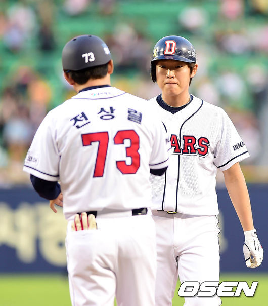 2회말 2사 1,3루에서 두산 정수빈이 좌전 적시타를 치고 전상렬 코치와 하이파이브를 하고 있다.