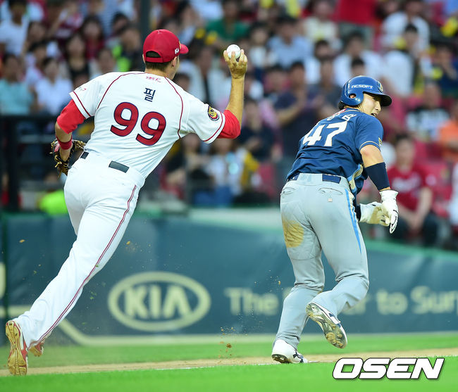 30일 오후 광주-KIA 챔피언스필드에서 열린 2014 한국야쿠르트 세븐 프로야구 KIA 타이거즈와 NC 다이노스의 경기, 3회초 2사 주자 1,2루 NC 테임즈의 2루수 앞 땅볼때 NC 나성범이 3루와 홈 사이에서 런다운에 걸리며 태그아웃을 당하고 있다.