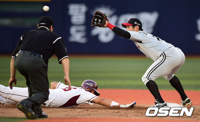 2회말 무사 2루 넥센 안태영이 LG 포수 최경철의 견제구에 2루로 귀루하고 있다.
