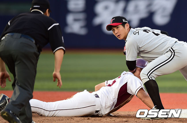 2회말 무사 2루 LG 포수 최경철의 견제구에 2루로 귀루한 안태영과 LG 오지환이 2루심의 판정을 기다리고 있다.