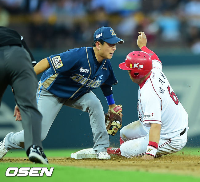 30일 오후 광주-KIA 챔피언스필드에서 열린 2014 한국야쿠르트 세븐 프로야구 KIA 타이거즈와 NC 다이노스의 경기, 3회말 1사 주자 1루 KIA 이대형의 타석때 1루 주자 박기남이 2루 도루를 시도했으나 NC 유격수 손시헌에게 태그아웃을 당하고 있다.
