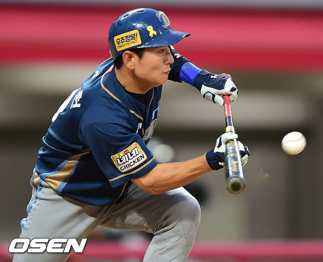 30일 오후 광주-KIA 챔피언스필드에서 열린 2014 한국야쿠르트 세븐 프로야구 KIA 타이거즈와 NC 다이노스의 경기, 4회초 1사 주자 1루 NC 손시헌이 타석에서 희생번트를 대고 있다.