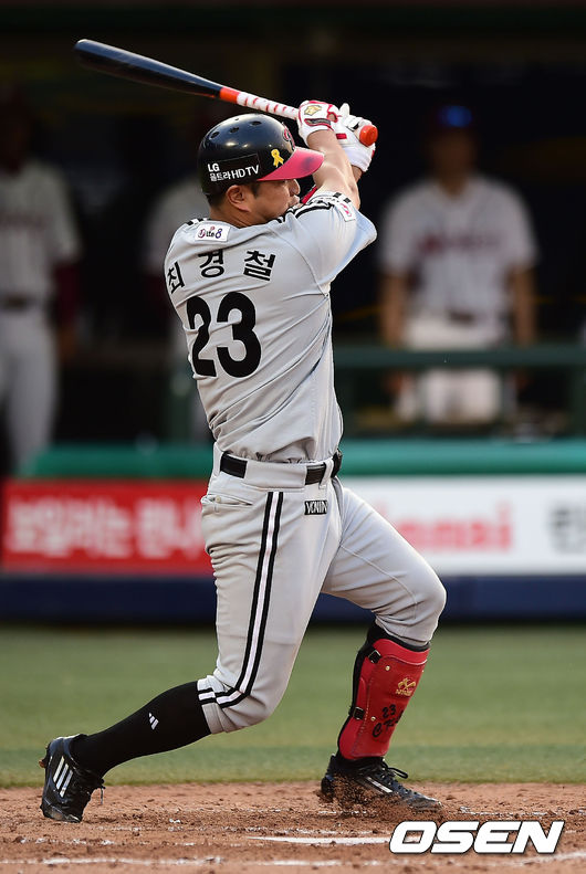 2회초 1사 2,3루 LG 최경철이 1타점 적시타를 때리고 있다.