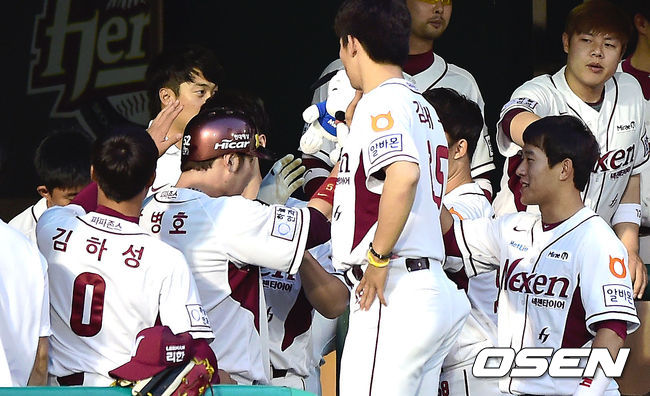 3회말 2사 넥센 박병호가 LG 김기표를 상대로 솔로 홈런을 때린 뒤 동료들에게 축하받고 있다.