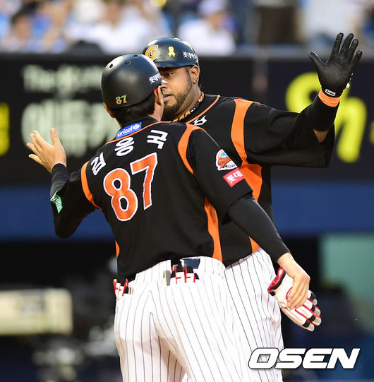4회초 2사에서 롯데 히메네스가 우월 솔로 홈런을 치고 홈에서 김응국 코치와 하이파이브를 하고 있다.