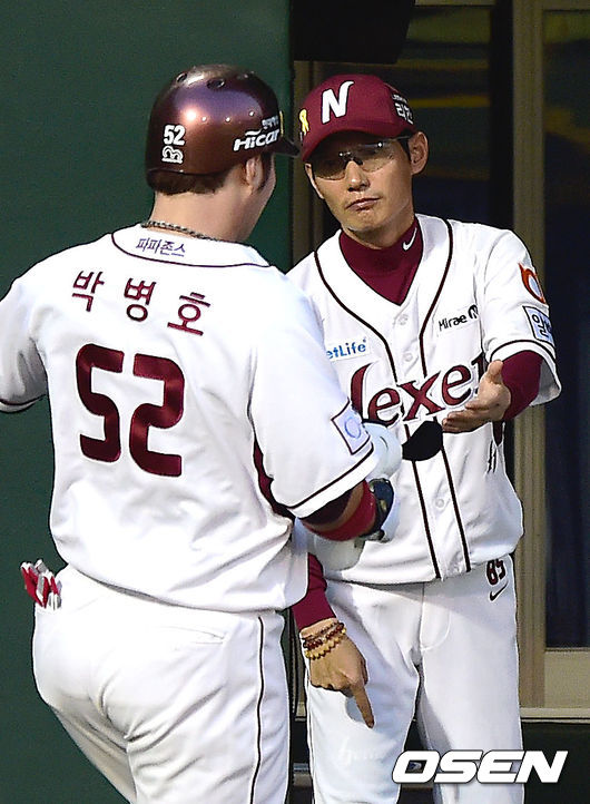 3회말 2사 넥센 박병호가 LG 김기표를 상대로 솔로 홈런을 때린 뒤 염경엽 감독과 하이파이브를 하고 있다.
