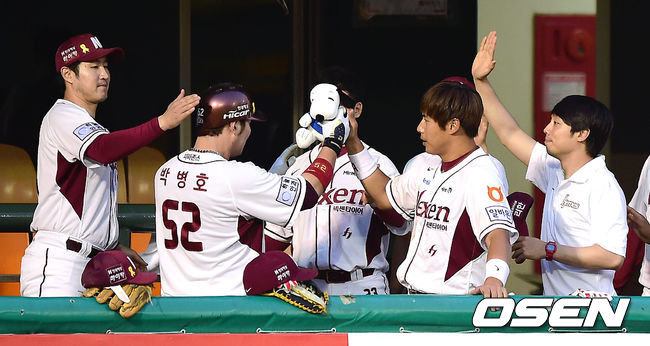 3회말 2사 넥센 박병호가 LG 김기표를 상대로 솔로 홈런을 때린 뒤 동료들에게 축하받고 있다.