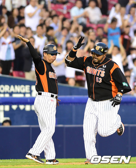 4회초 2사에서 롯데 히메네스가 우월 솔로 홈런을 치고 환호하고 있다.
