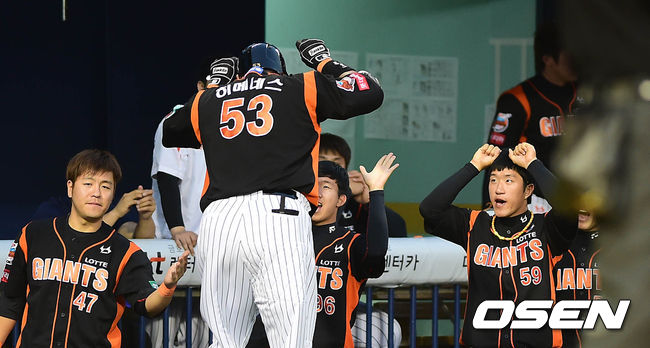4회초 2사에서 롯데 히메네스가 우월 솔로 홈런을 치고 더그아웃에서 동료들과 환호하고 있다.