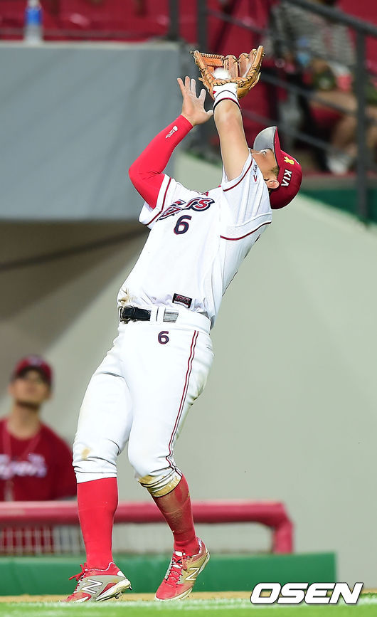 30일 오후 광주-KIA 챔피언스필드에서 열린 2014 한국야쿠르트 세븐 프로야구 KIA 타이거즈와 NC 다이노스의 경기, 5회초 2사 주자 1루 NC 나성범의 3루수 파울플라이때 KIA 3루수 박기남이 달려나와 처리하고 있다.