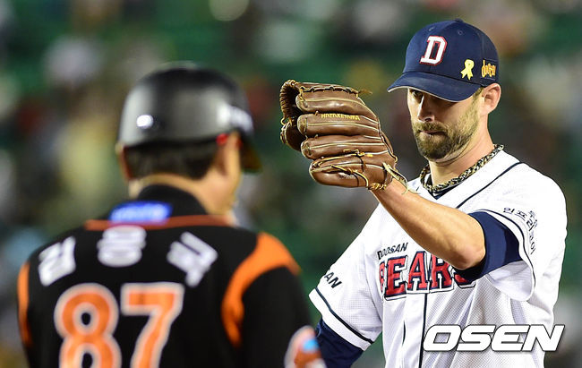 5회초 2사 2루에서 롯데 김문호를 내야땅볼로 처리한 두산 니퍼트가 더그아웃으로 가며 1루수 칸투에게 고마움을 전하고 있다.