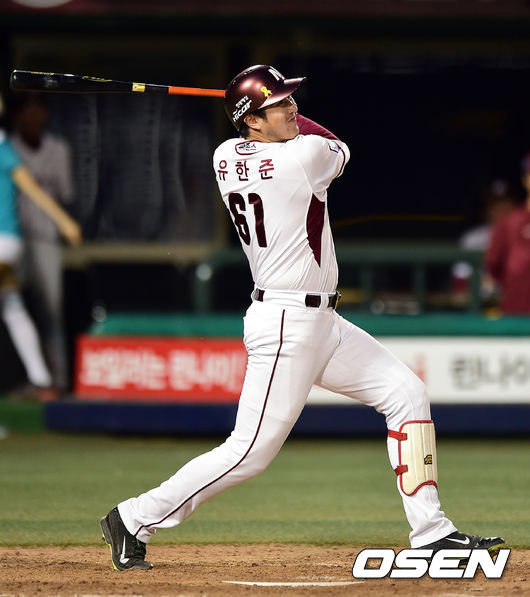 4회말 2사 1,2루 넥센 유한준이 1타점 적시타를 때리고 있다.