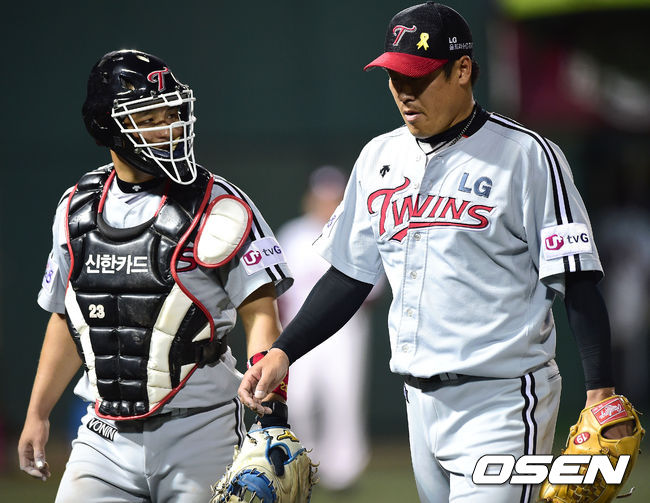 LG 최경철과 정현욱이 4회말 수비를 마치고 이야기를 나누고 있다.