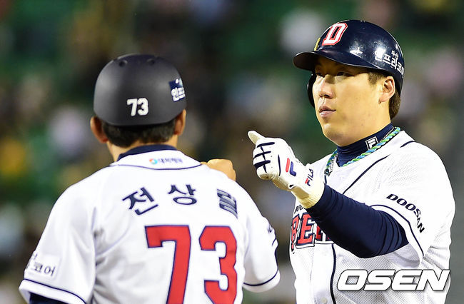 5회말 2사 3루에서 두산 김현수가 중전 적시타를 치고 전상렬 코치와 하이파이브를 하고 있다.