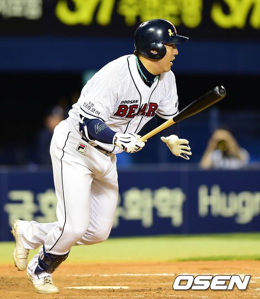5회말 2사 3루에서 두산 김현수가 중전 적시타를 치고 있다.