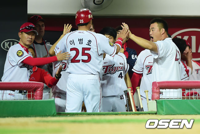 30일 오후 광주-KIA 챔피언스필드에서 열린 2014 한국야쿠르트 세븐 프로야구 KIA 타이거즈와 NC 다이노스의 경기, 5회말 1사 주자 1,3루 KIA 차일목 타석에서 NC 선발 이재학이 1루에 견제구를 던지며 실책을 범해 3루주자 이범호가 홈을 밟은 후 덕아웃에서 동료들과 하이파이브를 하고 있다.