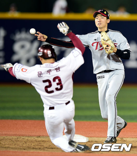 5회말 1사 1루 LG 김용의가 넥센 임태준의 유격수 땅볼때 1루 문우람을 포스아웃으로 잡아낸 뒤 1루로 송구하고 있다.