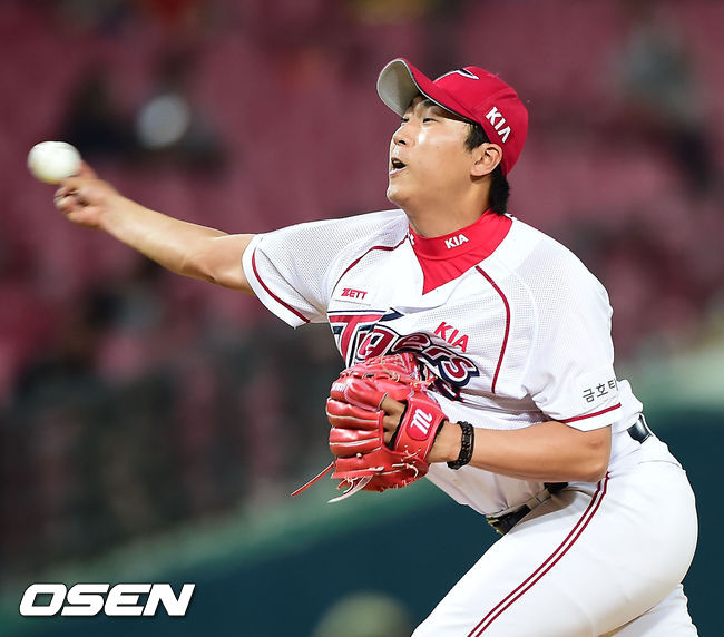 30일 오후 광주-KIA 챔피언스필드에서 열린 2014 한국야쿠르트 세븐 프로야구 KIA 타이거즈와 NC 다이노스의 경기, 6회초 KIA 선발 임준섭 대신 마운드에 오른 김지훈이 힘차게 공을 뿌리고 있다.
