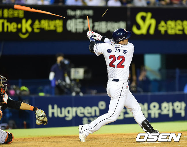 5회말 2사 1,2루에서 두산 홍성흔이 중전 적시타를 치고 있다.