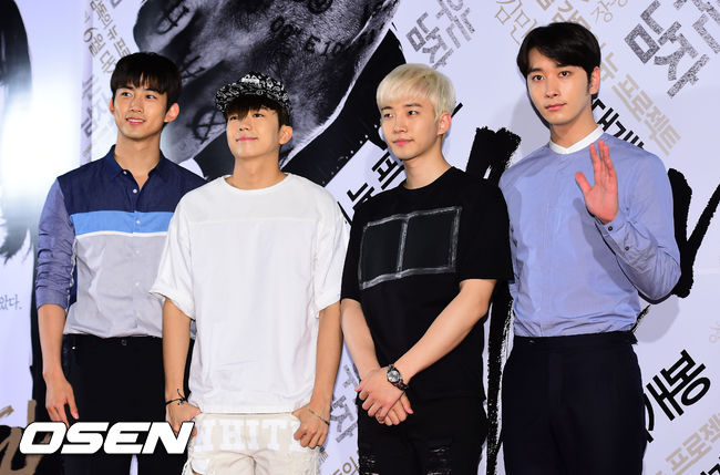 30일 오후 서울 영등포 CGV에서 진행된 영화 '우는 남자'(감독 이정범) VIP시사회에 참석한 2PM멤버 택연 우영 준호 찬성이 포토타임을 갖고 있다.