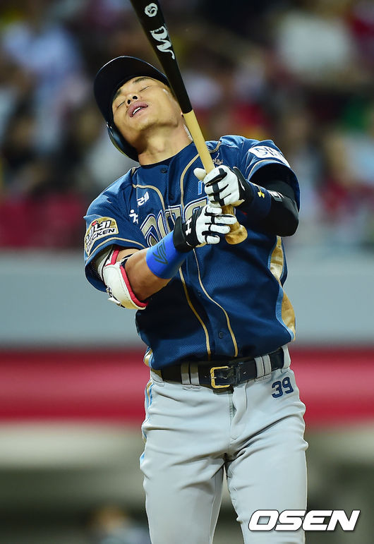 30일 오후 광주-KIA 챔피언스필드에서 열린 2014 한국야쿠르트 세븐 프로야구 KIA 타이거즈와 NC 다이노스의 경기, 6회초 2사 주자 1,3루 NC 이종욱의 좌익수 앞 뜬공을 날리며 아쉬운 표정을 짓고 있다. 이 타구는 KIA 유격수 김선빈이 볼을 잡아내지 못하며 2타점 적시타로 기록됐다.