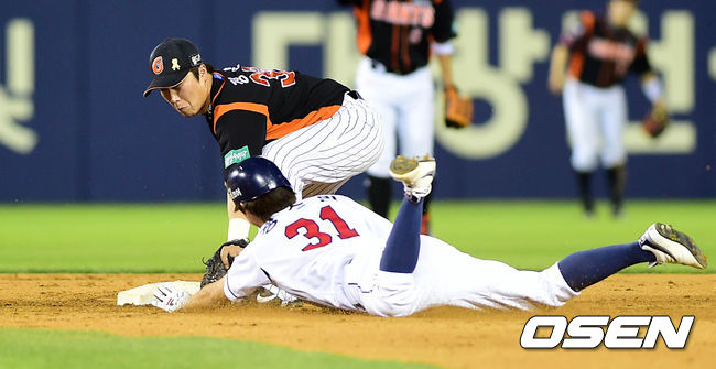 6회말 2사에서 두산 정수빈이 좌중간 안타를 치고 2루로 쇄도했으나 롯데 정훈에 의해 태그아웃되고 있다.